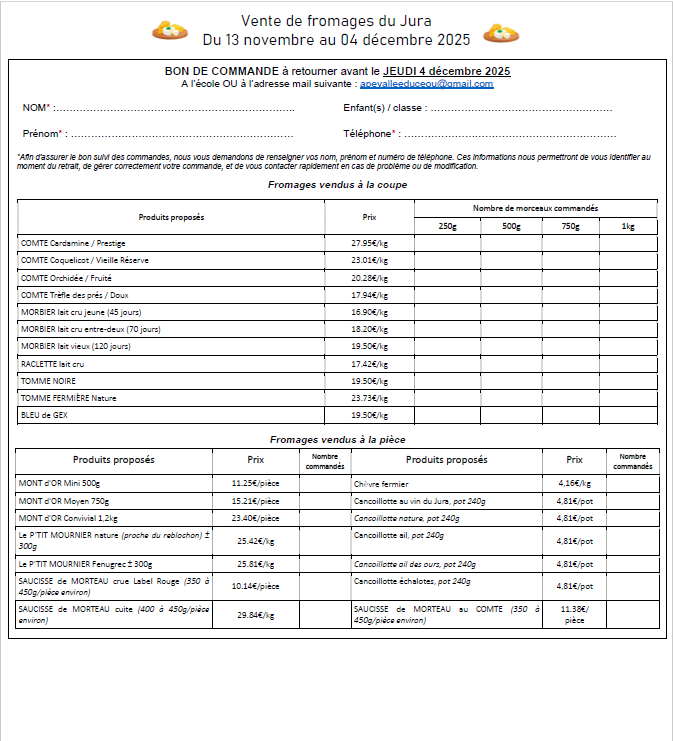 L’Association des Parents d’Élèves (APE) relance, comme chaque année, sa grande vente de fromages et saucisses en provenance directe d’une fruitière artisanale du Jura ! Une belle occasion de se régaler tout en soutenant les projets des trois écoles du RPI.